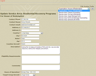 To ease the administrative burden on you as the network coordinator, Meet The Need permits service providers to log back in to their directory listing through your web site and update their own information. They may even add or delete their service offerings. You will see all of their updates on your administrative "back end" interface.