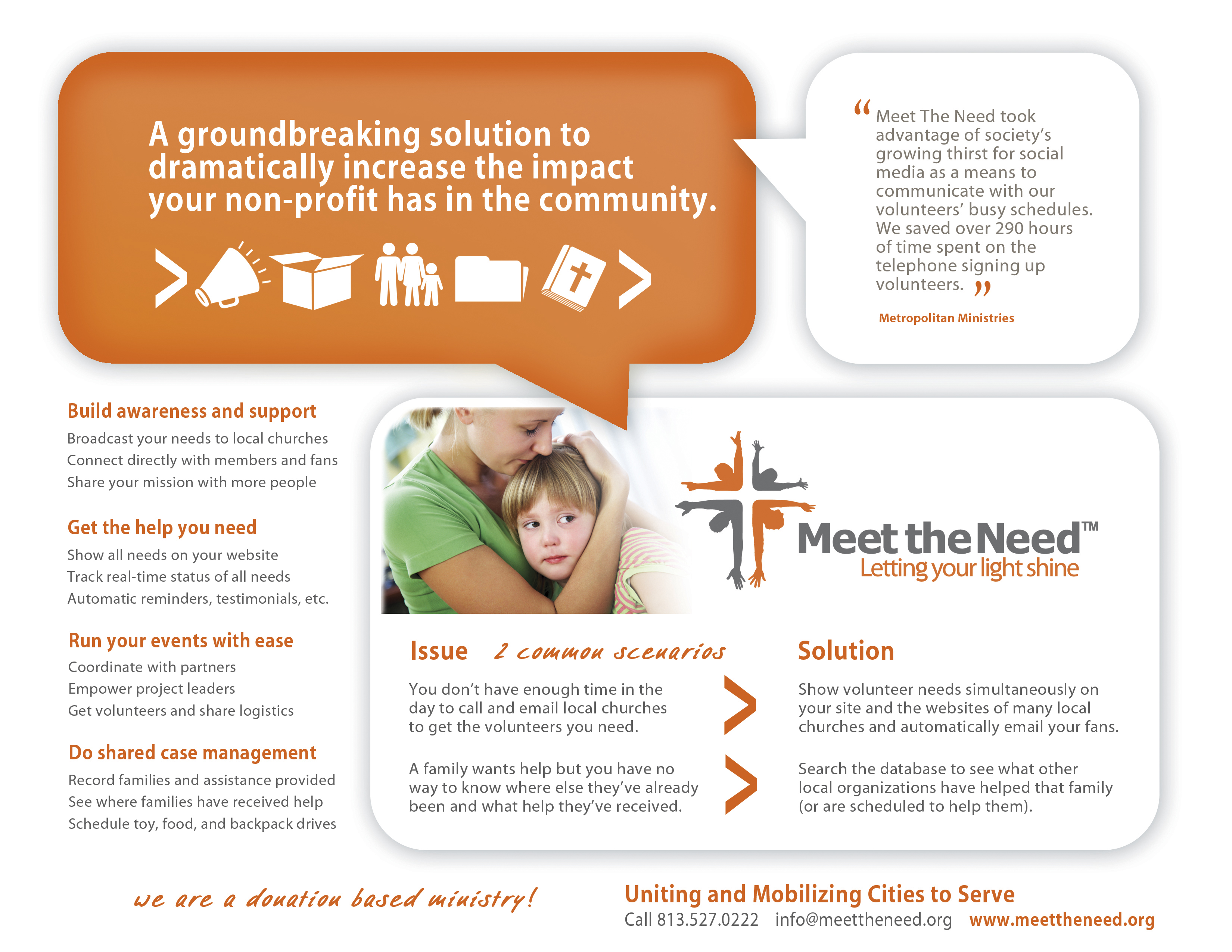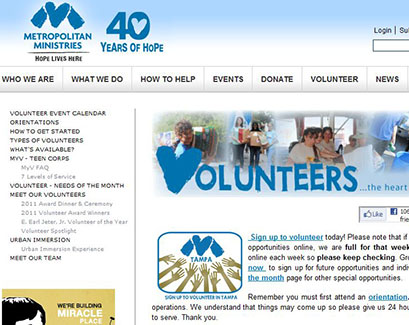 "For over 37 years, Metropolitan Ministries has been delivering hope to individuals and families in crisis through services that alleviate suffering, promote dignity, and instill self-sufficiency. The form of that delivery has varied from time to time, but one constant has remained the same—volunteers. Known as the Y factor internally, our volunteer corps has grown steadily during the years and enabled us to deliver hope in greater volumes than ever before. However, during the 2009 holiday season, volunteer contributions reached record highs here at Metropolitan Ministries due in no small part to the technological advances offered by Meet the Need.