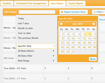 Run detailed reports on service history, items given, demographics, etc.